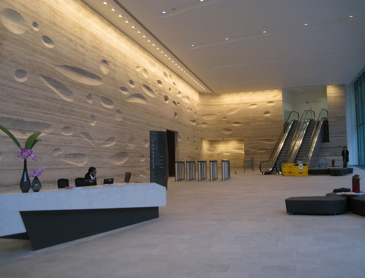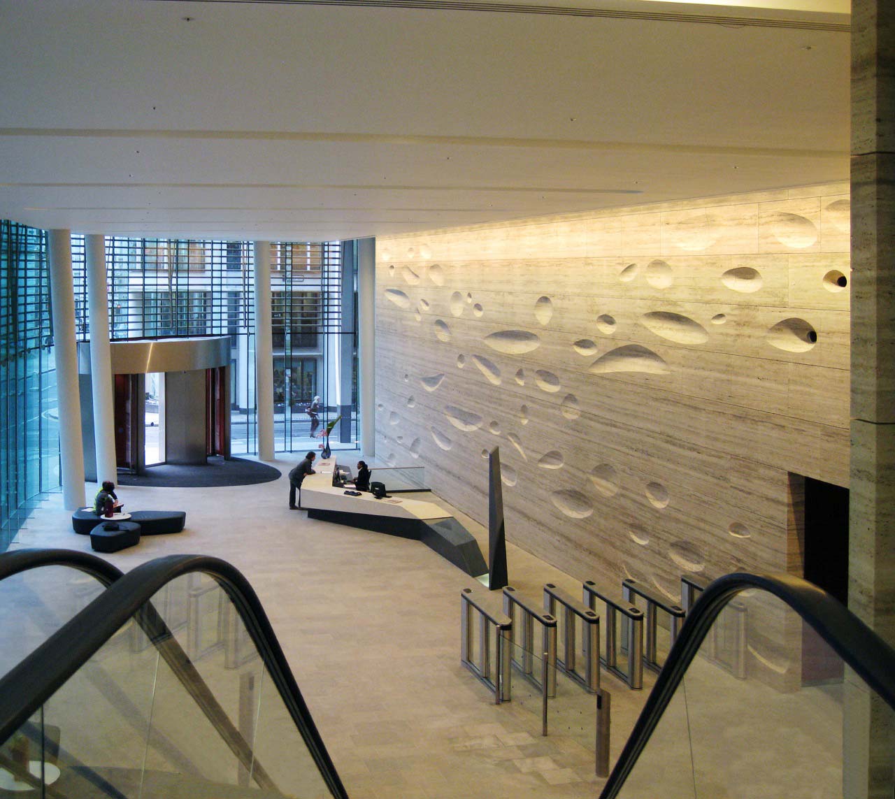 Early in 2008 the teams of Andre Schuberth and stonemason Laurent Chauvaux joined forces to carry out the stone work for a large interior wall structure. It was to become the most striking visual feature of the atrium at 20 Gresham Street in the City of London, and an award-winning piece of architecture. The wall in question was 8 metres high and 60 metres long, comprised entirely of Travertine blocks from Italy.