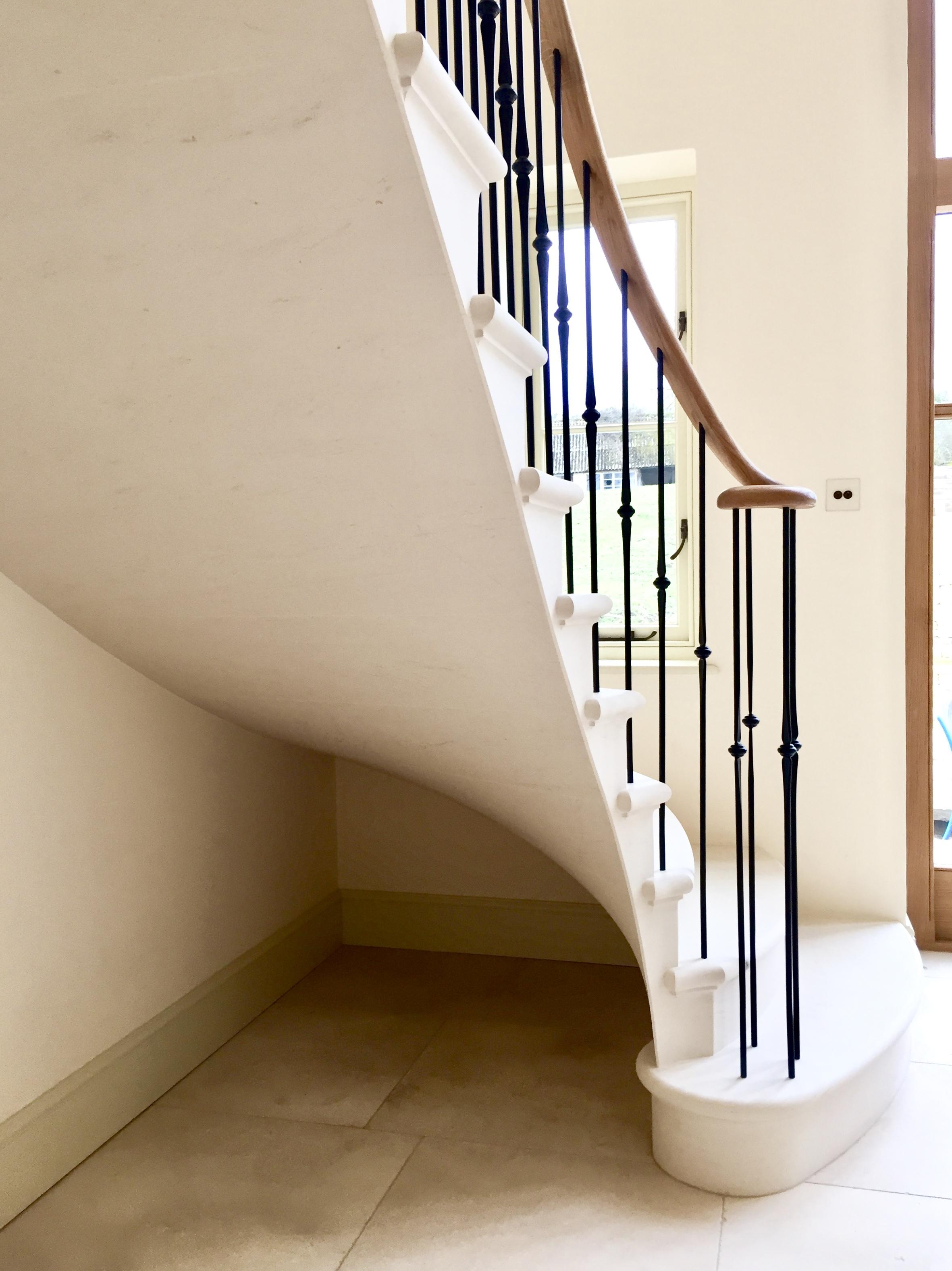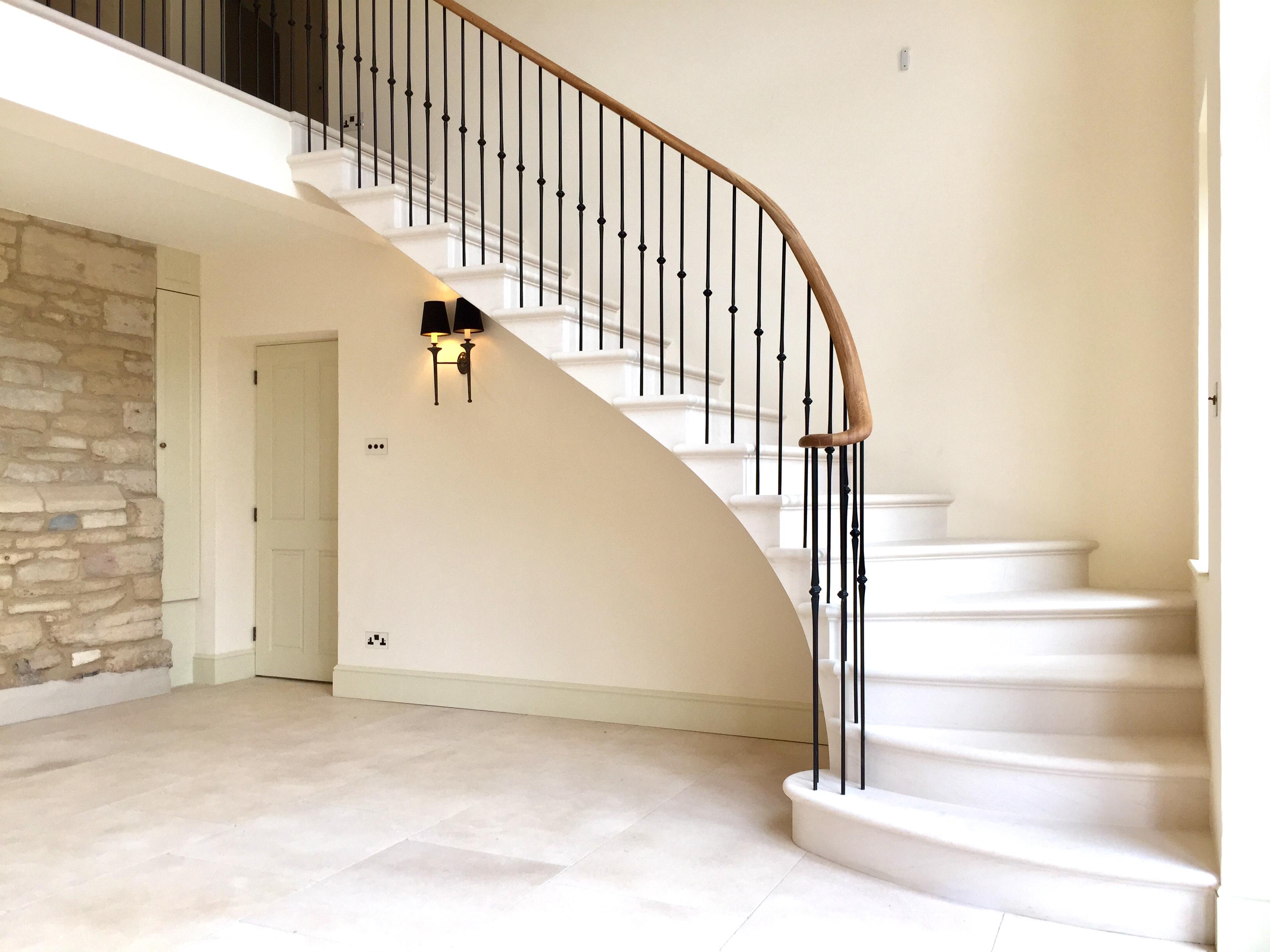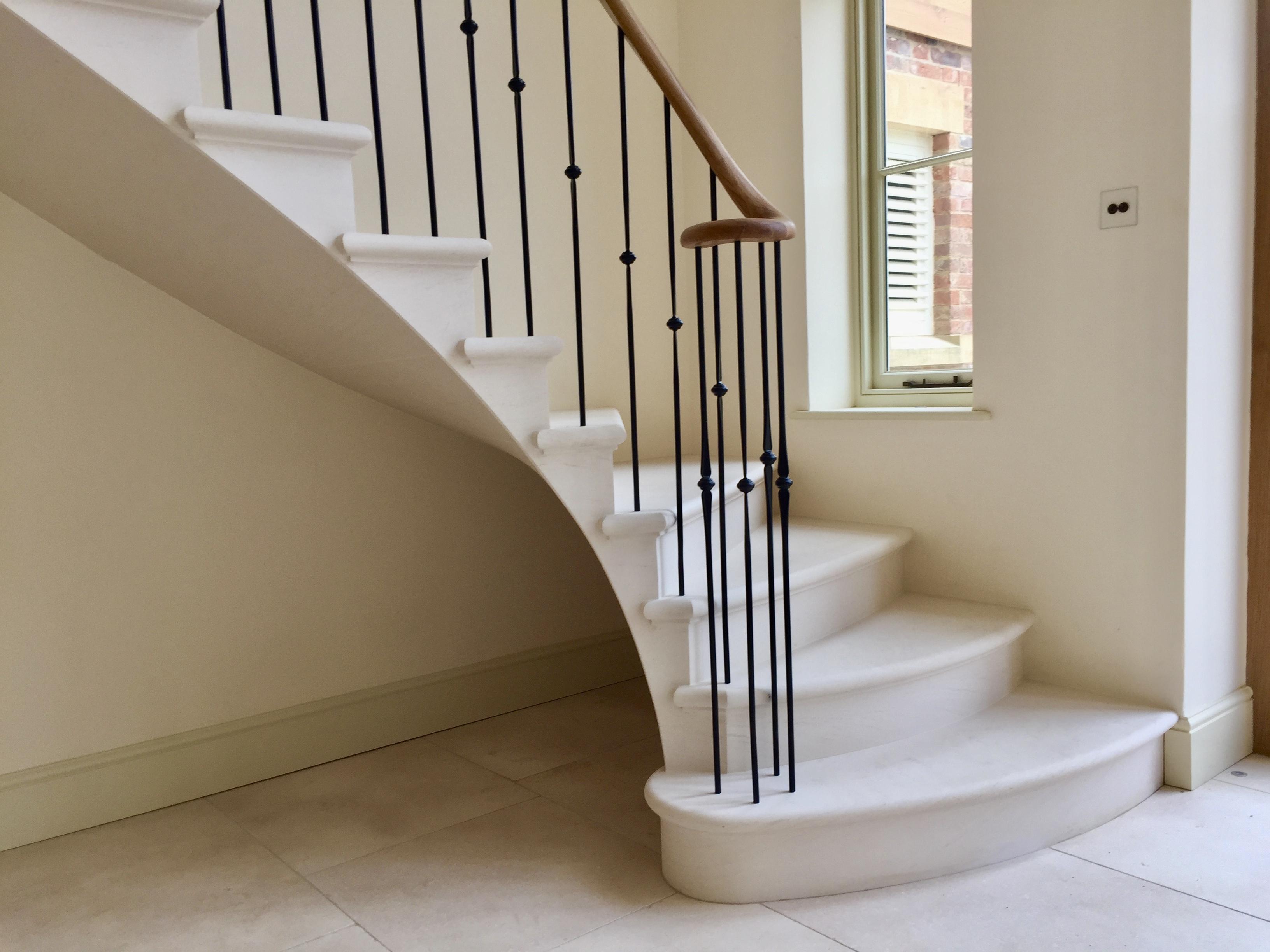 We made this stone staircase for a private client near Evesham in Worcestershire, in 2017. It is a fairly simple design but nonetheless very elegant. We also love the simplicity of the balustrade with its metal balusters and the wooden handrail. The beauty is in the detail. If you look very carefully, you will notice that the metal balusters are entering the stone steps seamlessly without a shoe. The shoe is installed in most cases to cover the holes made to hold the baluster. We take great care when we are drilling the steps to get a very need hole with a very small joint between the metal and the stone. This is allowing us to get rid of the shoe. This approach is giving our clients a much nicer looking product.
