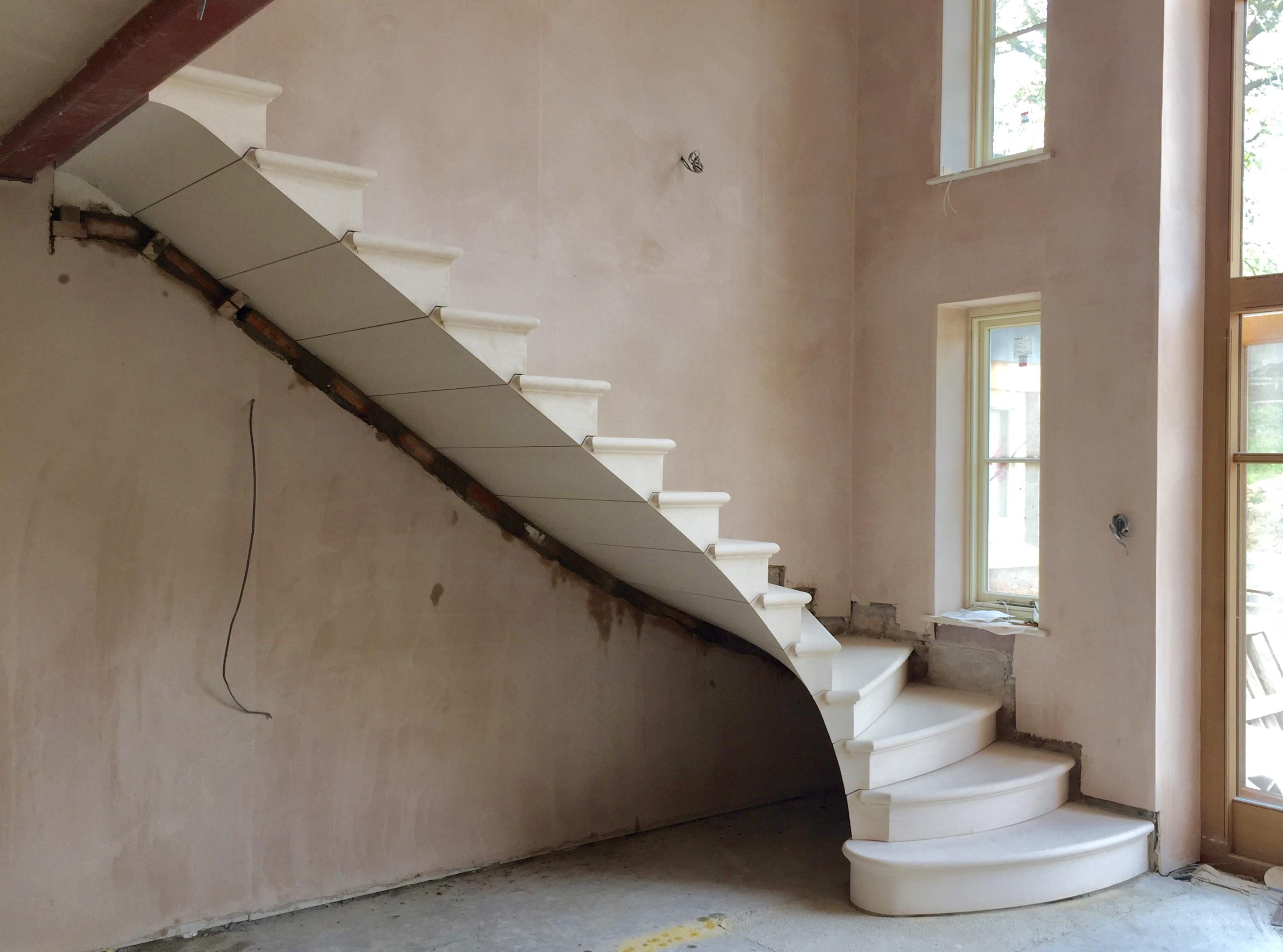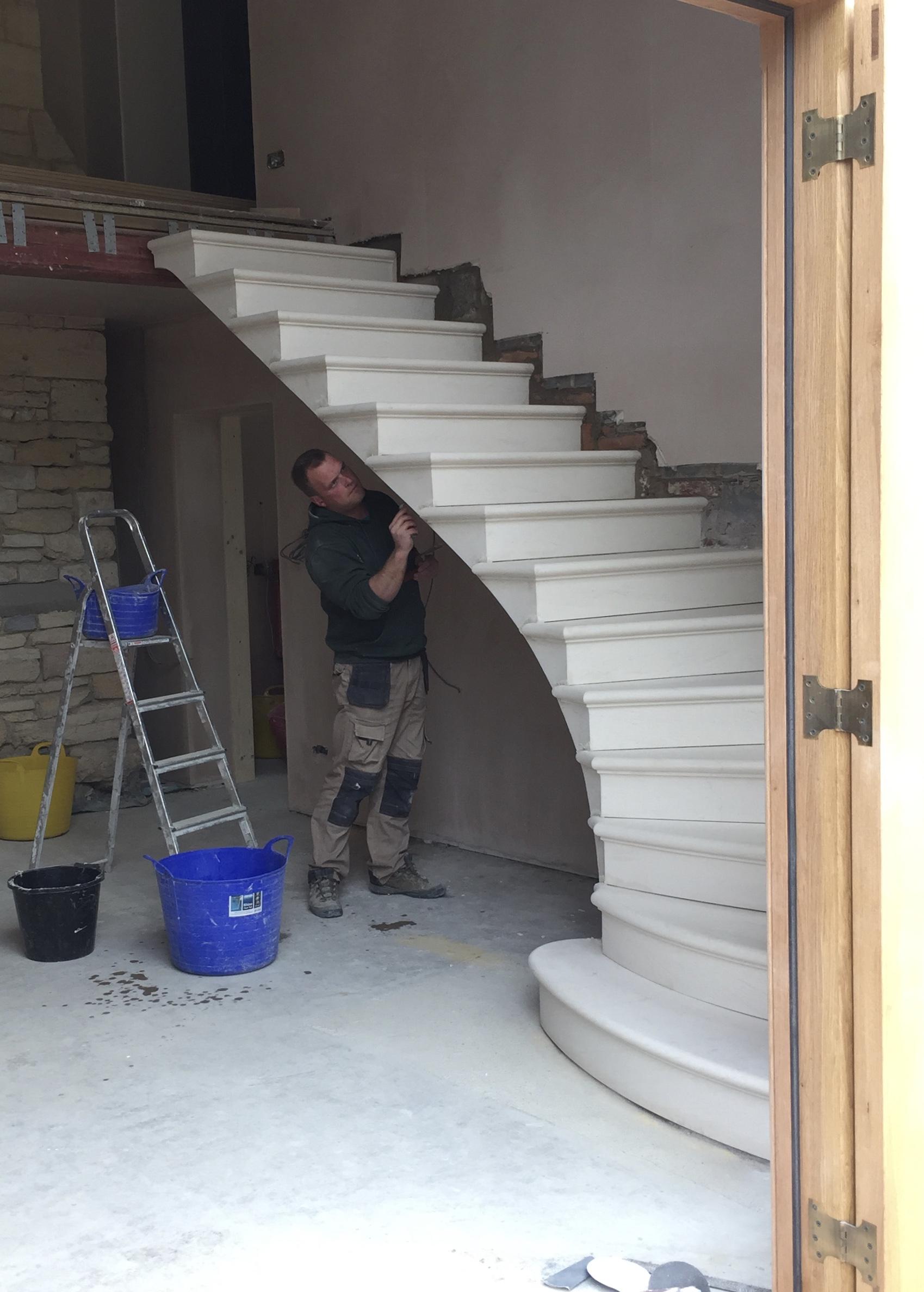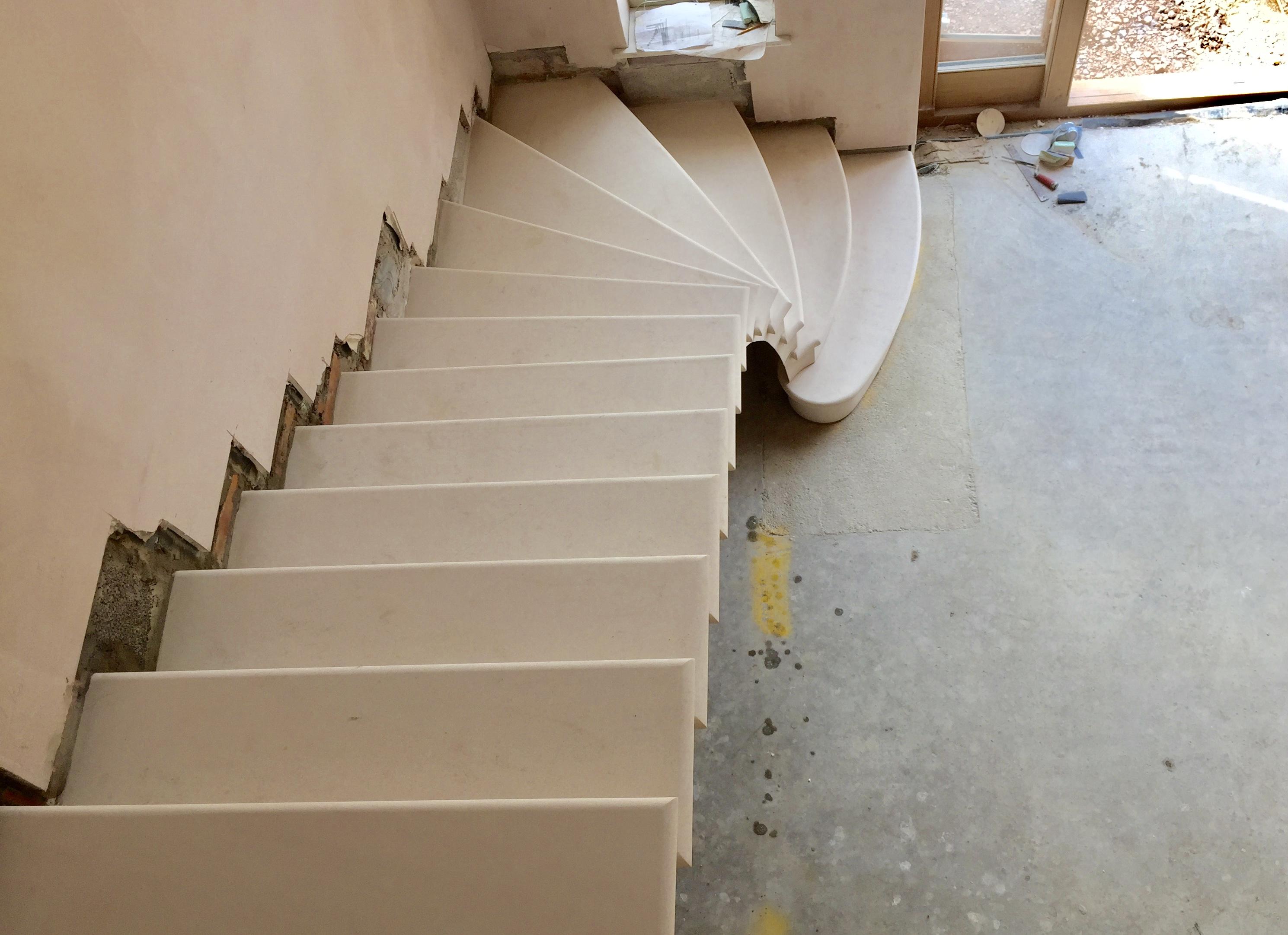 We made this stone staircase for a private client near Evesham in Worcestershire, in 2017. It is a fairly simple design but nonetheless very elegant. We also love the simplicity of the balustrade with its metal balusters and the wooden handrail. The beauty is in the detail. If you look very carefully, you will notice that the metal balusters are entering the stone steps seamlessly without a shoe. The shoe is installed in most cases to cover the holes made to hold the baluster. We take great care when we are drilling the steps to get a very need hole with a very small joint between the metal and the stone. This is allowing us to get rid of the shoe. This approach is giving our clients a much nicer looking product.