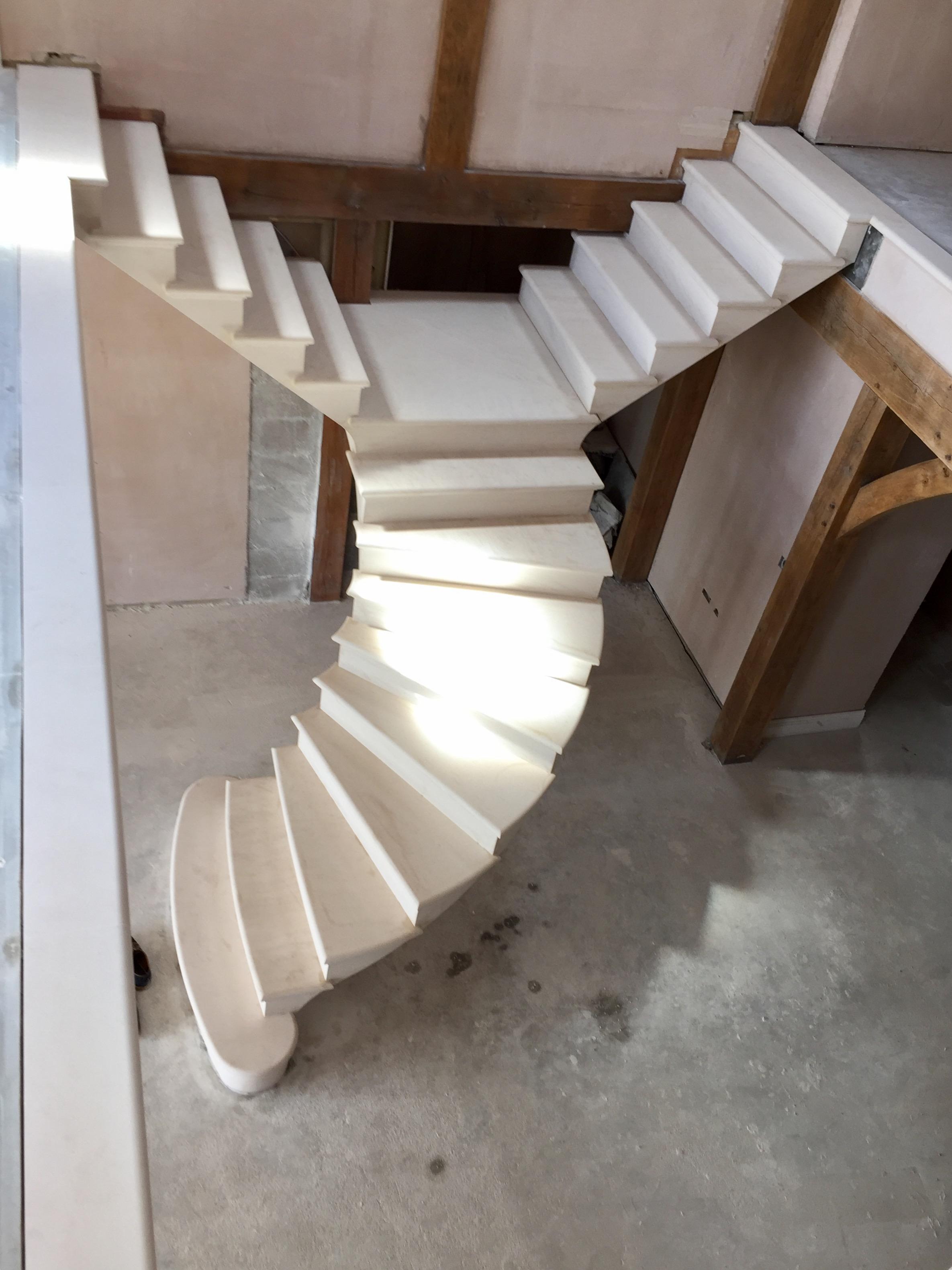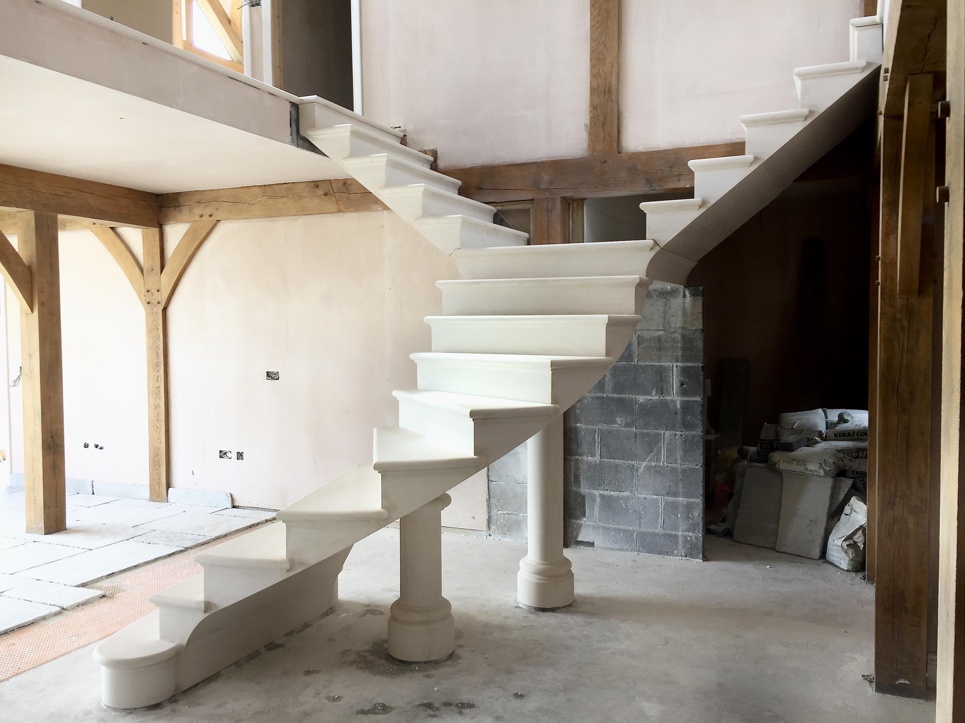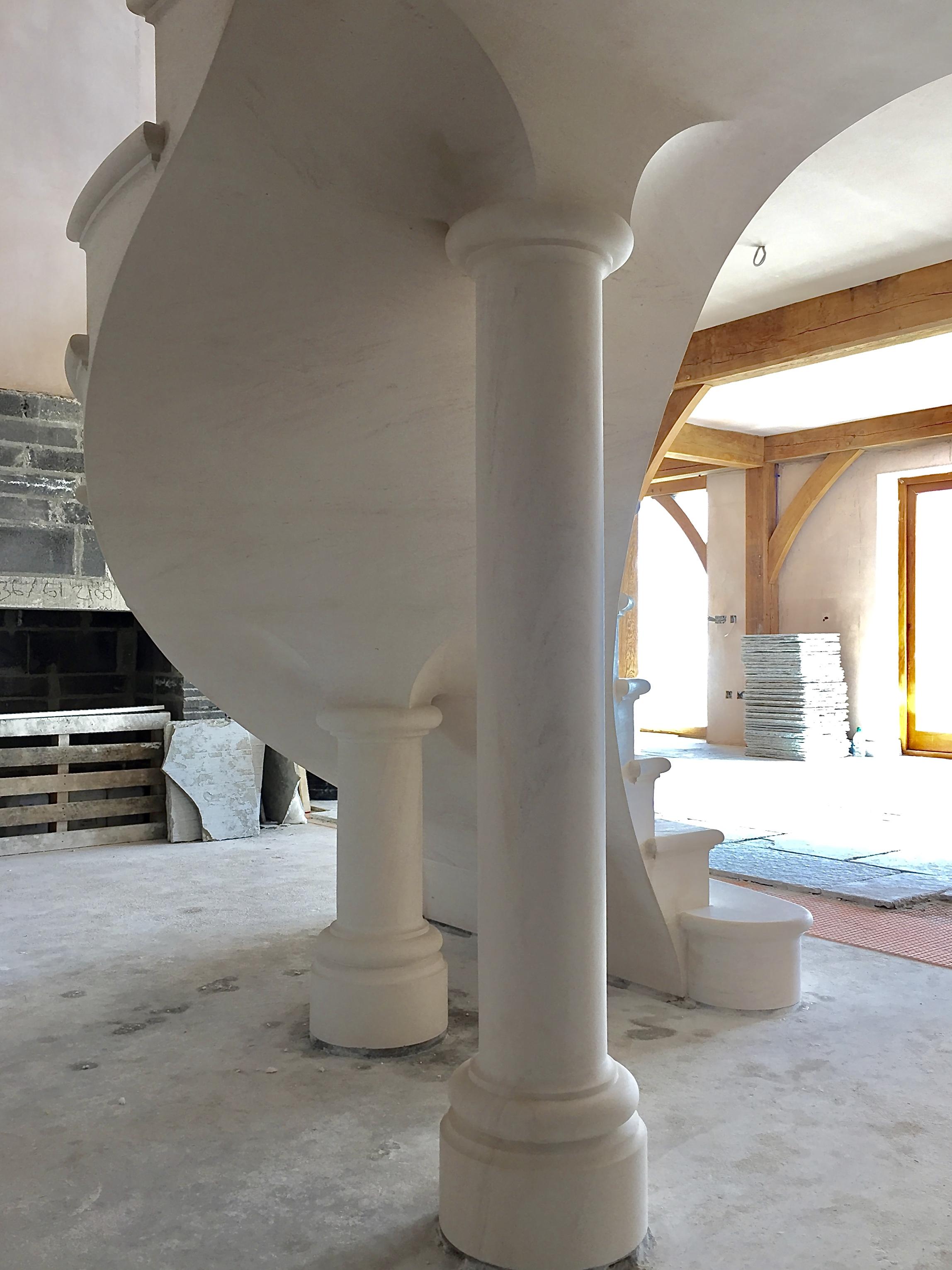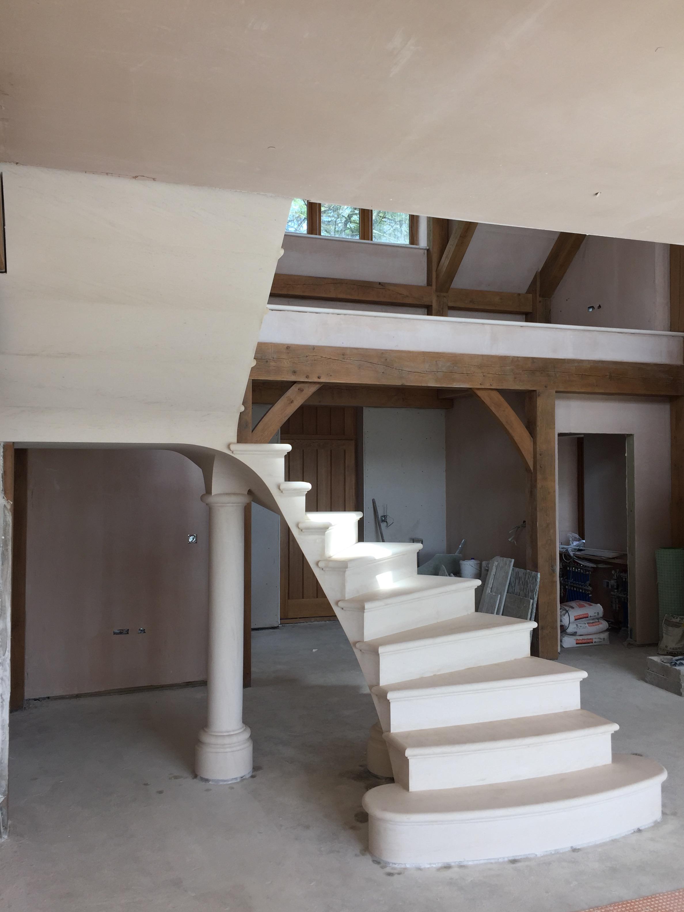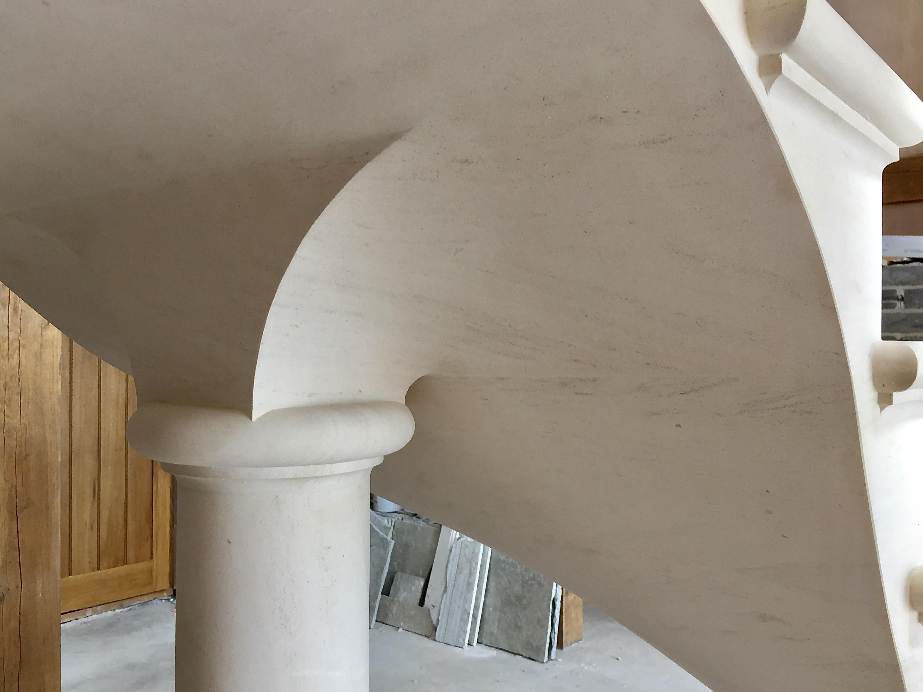 This stone staircase has been a particularly interesting challenge to design and build. As the house is a wooden framed build, we could not use traditional building methods to create this outstanding solid stone staircase. We had to allow certain parts of the staircase to be able to move with the potential movement of the wooden frame of the house. That is also a reason why we had to place some additional columns under the curved part of the stone stairs. We believe that these details make this staircase even more interesting to look at.