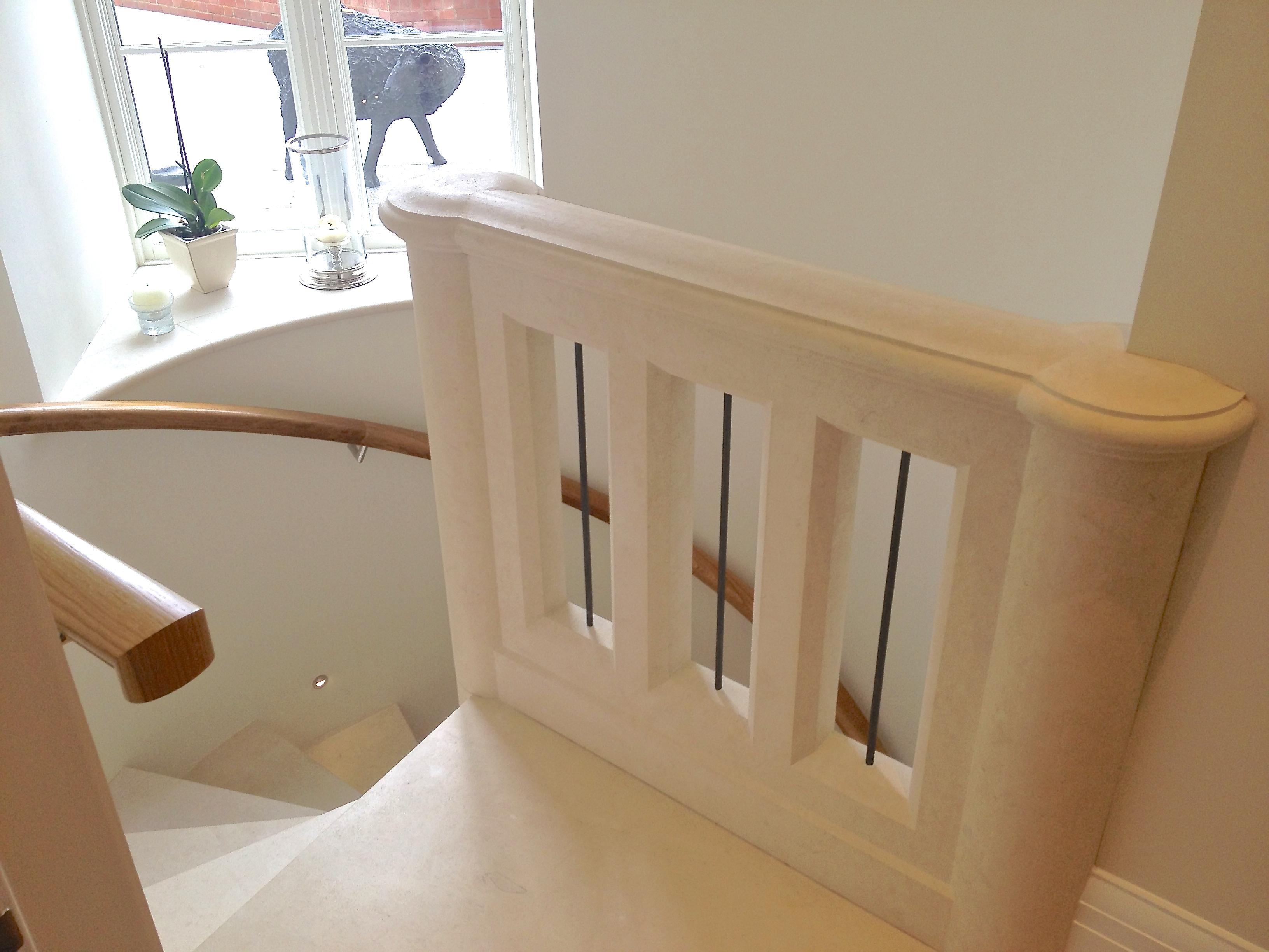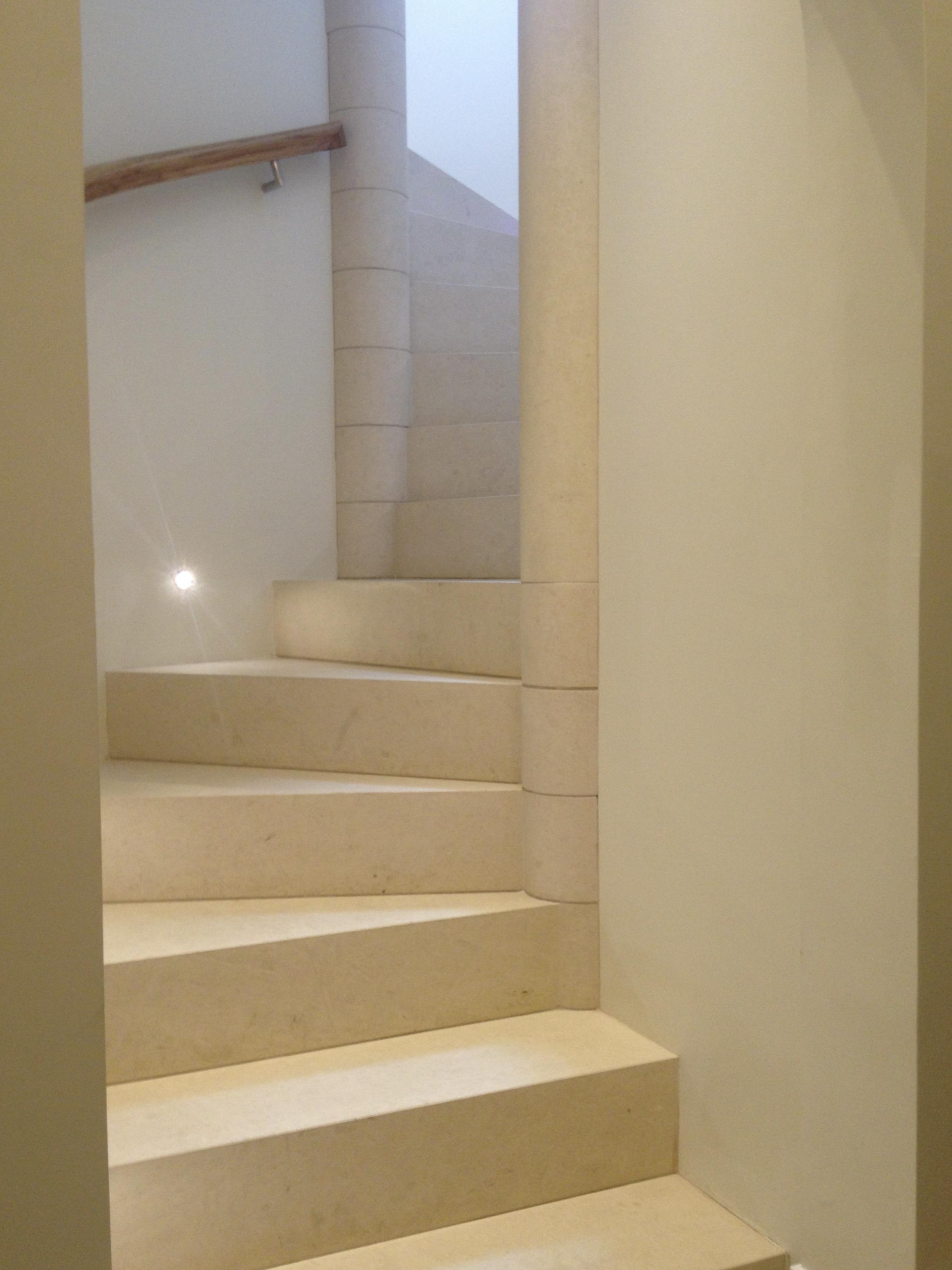 Stone Spiral staircases are perfect if you need a staircase for a very tied space. By using a solid stone it will give the staircase a completely different level of luxury and aesthetical appeal. The natural beauty of the material and the clever design of Carvero's staircases will add something very special to your home. This staircase has been fitted for a client near Birmingham. It is leading from the kitchen down to the cinema room and the wine cellar.